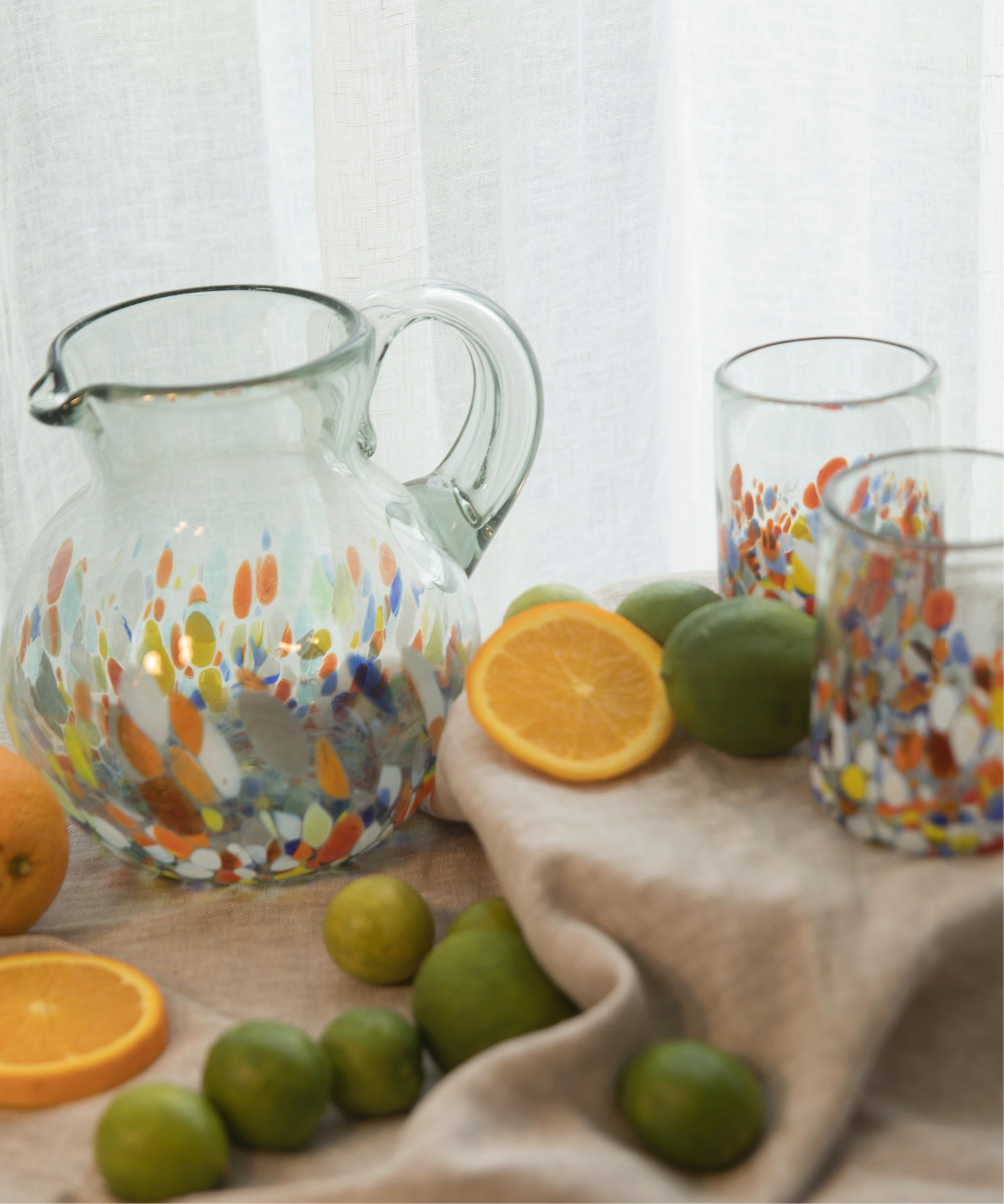 Jarra en vidrio soplado artesanal. Disponible en color amatista y con pintas de colores.